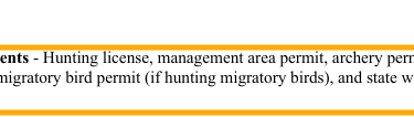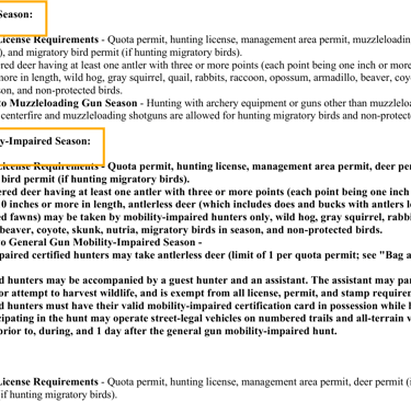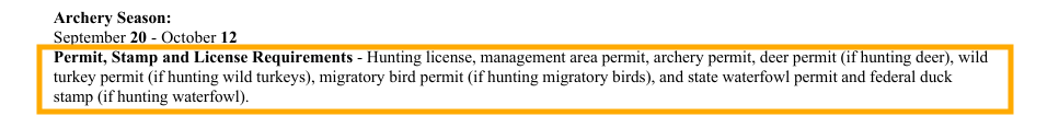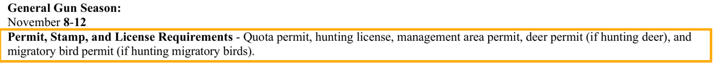 Every season (or hunt) listed also includes a section called "Permit, Stamp, and License Requirements." This tells you what licenses and permits are required to hunt during that specific hunt or season.