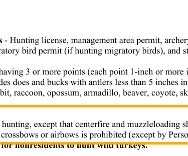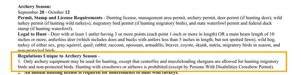 The first place you should check to determine what weapon/firearm is legal during your hunt is under the specific hunt section. For example, during the archery season "Only archery equipment may be used for hunting, ...."