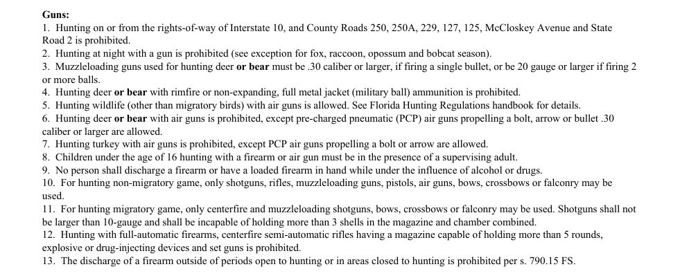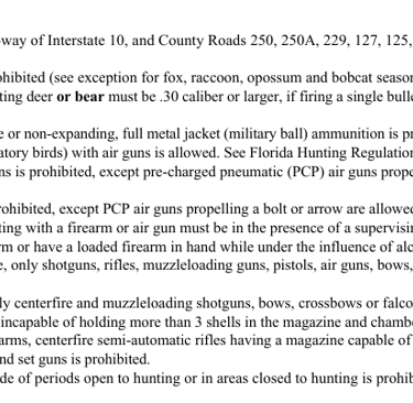 The second place to check is under the "Guns" section, which lists out the more general regulations regarding different types of firearms that are allowed or not allowed. For example, you are not allowed to hunt with a full-automatic firearm, centerfire semi-automatic rifle that has a magazine capable of holding more than 5 rounds. You also cannot hunt deer or bear with rimfire or non-expanding, full metal jacket (military ball) ammunition.