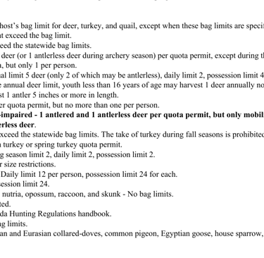 Every brochure lists Bag and Possession Limits for each game species. This tells you how many animals you can harvest daily and possess in total.