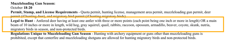 The second location you need to use to determine what is legal to take is within each of the listed hunting seasons under "Legal to Hunt." This example shows that during the Muzzleloading Gun Season, you are only allowed to take antlered deer having at least one antler with three or more points (where each point only counts as a point if it is one inch or more in length) OR it has a main beam length of 10 inches or more. It also lists other species legal to take during this season.