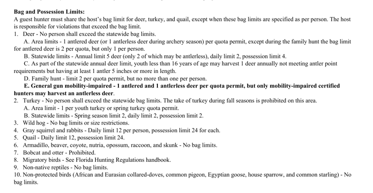 On Allapattah Flats, deer are listed under the Bag Limits section with the following: